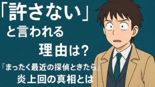 アニメ情報 「許さない」と言われる理由は?『まったく最近の探偵ときたら』炎上回の真相とは 『まったく最近の探偵ときたら』は、ゆるいギャグとシュールな世界観が魅力の人気シリーズです。しかし、その中に突如として登場する「許さない」というセリフが、多くの視聴者・読者の心をざわつかせています。さらに、一部で“炎上回”とまで噂されるホラー... 2025.09.10 アニメ情報